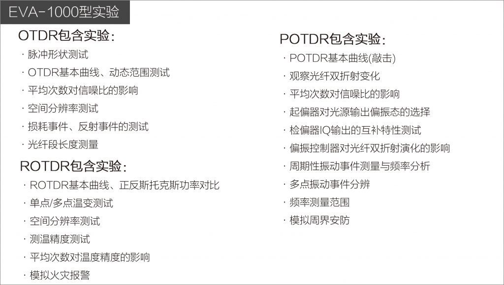 本系列教學儀器,模塊化組合設計,可實現多機理的分布式光纖傳感技術。其中,EVA-1000型可組合搭建OTDR、POTDR以及ROTDR三種分布式光纖傳感系統。適用于光電信息工程、測控技術、儀器儀表、通信工程、自動化、電氣工程、土木工程、交通工程等專業的本科和研究生傳感技術教學、畢業設計及創新創業競賽等,是真正的啟發式教學設備。同時可兼顧起步階段的分布式光纖傳感技術研發人員開展相關科研工作,也可作為大型工程結構健康監測技術人員和工程管理人員的技術培訓教儀。